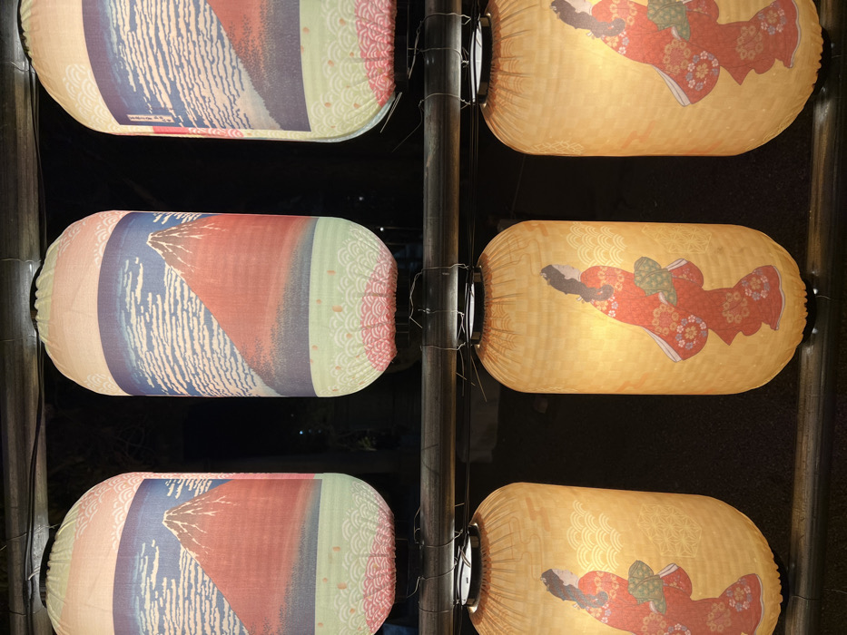 - "Six illuminated cylindrical Japanese lanterns are displayed in two horizontal rows against a dark, out-of-focus background in Taito, Japan" by FM-Te9wG2, licensed under CC BY 4.0