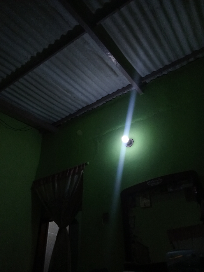 This image depicts the interior of a dimly lit room in Juan Griego, Venezuela. The ceiling consists of corrugated, possibly asbestos-cement, panels supported by dark structural beams. The walls are painted a medium green, showing some surface irregularities and minor cracks. A single, exposed spherical light bulb, emitting a bright white light with a visible downward beam, is affixed to the upper right wall. Below and to the left of the light source, a dark, patterned curtain covers an opening, likely a window or doorway. In the lower right foreground, a dark furniture piece, possibly a dresser or cabinet, is partially visible, featuring a reflective top surface. No individuals or specific actions are discernible.
