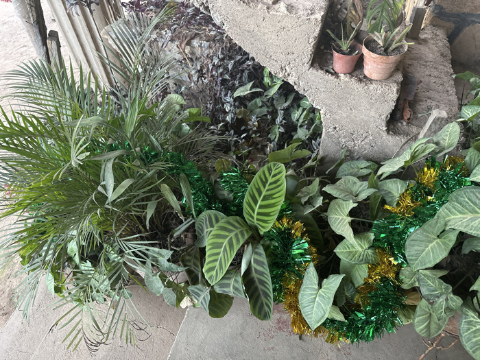 The image depicts a static scene of various green plants arranged around a multi-tiered concrete structure, situated in Jos, Nigeria. On the left, a large palm-like plant with fronded leaves dominates, alongside other diverse foliage. Towards the bottom center-left, plants with distinctive striped leaves are visible. A rough, light gray concrete structure, possibly a planter or decorative steps, occupies the upper right and center, holding two small potted plants (one reddish-brown, one lighter terracotta). Green and gold tinsel garlands are interwoven among the plants, particularly prominent in the lower center and right, where they are nestled among arrowhead-shaped leaves. The background behind the palm on the upper left shows a light-colored, possibly wooden or concrete, vertical structure. The ground surface appears to be a light-colored pavement or concrete. No people or active interactions are present.