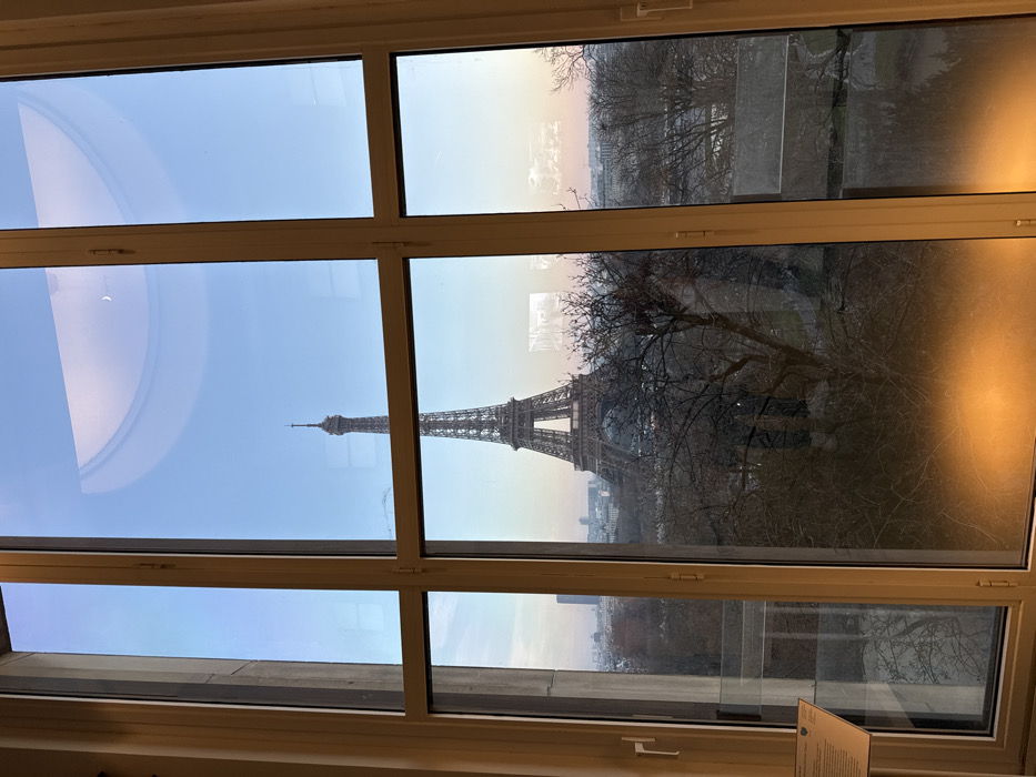 The image displays a panoramic exterior view of the Eiffel Tower in Paris, France, framed by a multi-pane window