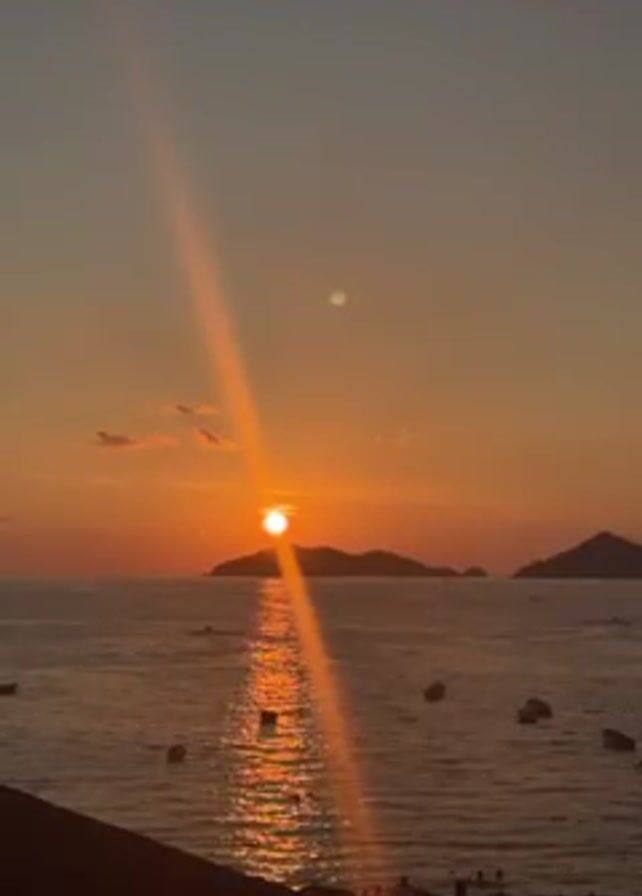 sunset over the ocean with islands in the distance. The sun is partially obscured by the horizon and casts a bright orange and yellow glow. The water reflects the sunlight, creating a sparkling effect. There are several boats scattered across the water. In the foreground, a partial view of a building and people is visible. The sky is a mix of orange, yellow, and blue.