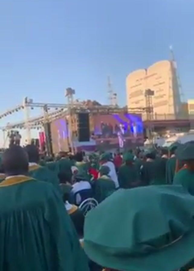 A crowd clad in green gowns and caps is watching a performance on a large screen. The performance features multiple individuals on stage, seemingly a musical act. In the background, a large monument of the Ten Commandments is visible. The setting appears to be an outdoor event.