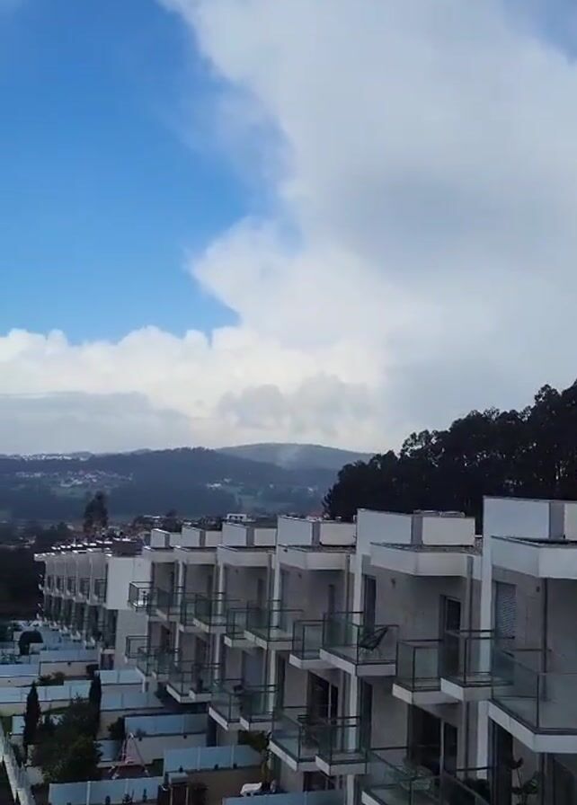 view from a balcony, panning across a residential area towards a distant cityscape