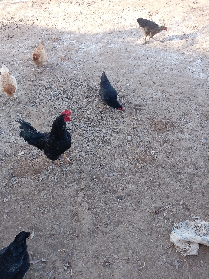 This image, captured in Chimbay, Uzbekistan, depicts a ground-level view of an outdoor, unpaved area populated by several chickens under direct sunlight. The environment consists of dry, light brown soil with scattered debris, including dried leaves and small particulate matter. Lighter, potentially dusty or slightly frost-covered, patches are visible on the ground in the background. Six chickens are present: 1. A black rooster with a bright red comb and wattles, positioned in the lower-middle-left foreground, standing and facing slightly right. 2. A light brown hen, standing in the upper-left quadrant, facing right. 3. A creamy-white and light brown hen, positioned in the mid-left, with its head lowered, appearing to peck the ground. 4. A black hen, located in the mid-right, with its head lowered, also appearing to peck the ground. 5. A dark brown and grey speckled hen, standing in the upper-right quadrant, facing left. 6. A portion of a black hen is visible in the bottom-left corner, facing the upper-left. No human subjects are visible. In the bottom-right corner, a torn, white woven polypropylene sack is present on the ground. The lighting suggests a clear day, with visible shadows indicating a light source from the upper-left.