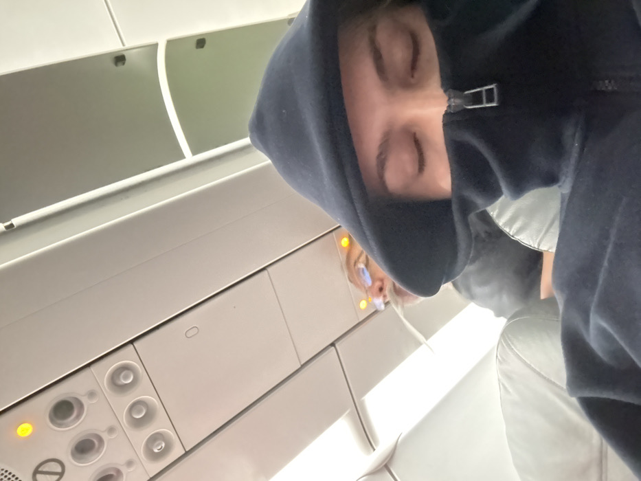 The image displays the interior of an airplane cabin, viewed from a passenger's seat