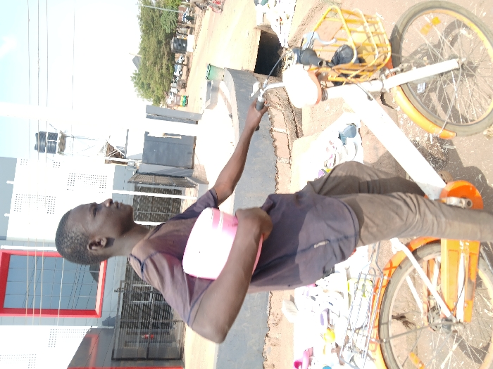 A young male is depicted outdoors in Heany, Zimbabwe, positioned alongside a white bicycle with orange fenders, chain guard, and pedals. He has dark skin and short dark hair, wearing a dark short-sleeved t-shirt and dark trousers. He holds a light pink plastic container under his left arm, with his right hand on the bicycle's handlebars. The bicycle features a light-colored seat and an orange front basket containing a dark object. In the background, to the left, a multi-story building with a grey upper facade and a red-framed window is visible. To the right, a paved road extends into the distance, bordered by trees and showing several indistinct vehicles. The immediate ground to the left of the bicycle displays loose dirt and a scattered collection of various colored footwear on a light-colored sheet. A metal water tower supporting a black tank is situated in the mid-ground right.