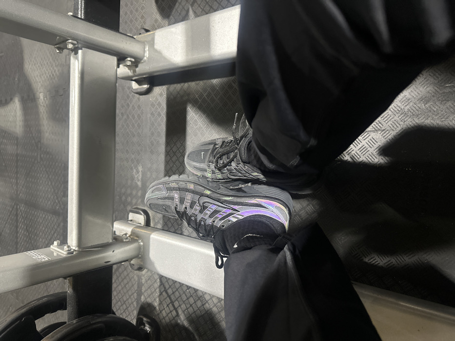 A first-person, downward-angle view captures the lower legs and feet of an individual positioned within an indoor gymnasium. The individual wears dark trousers and dark athletic shoes. The left foot is shod in a grey and iridescent Nike Vomero 5 sneaker with visible branding, while the right foot wears a similar dark athletic shoe. Both feet rest on a dark grey, textured rubber gym floor matting. In the foreground, components of silver-colored metal gym equipment are visible, including two sturdy vertical uprights secured with bolts, a horizontal crossbar, and the edge of a black weight plate on the far left. The scene indicates a static moment within a fitness environment. The specific location within Tonbridge and Malling, United Kingdom, is not discernible from the provided visual information.