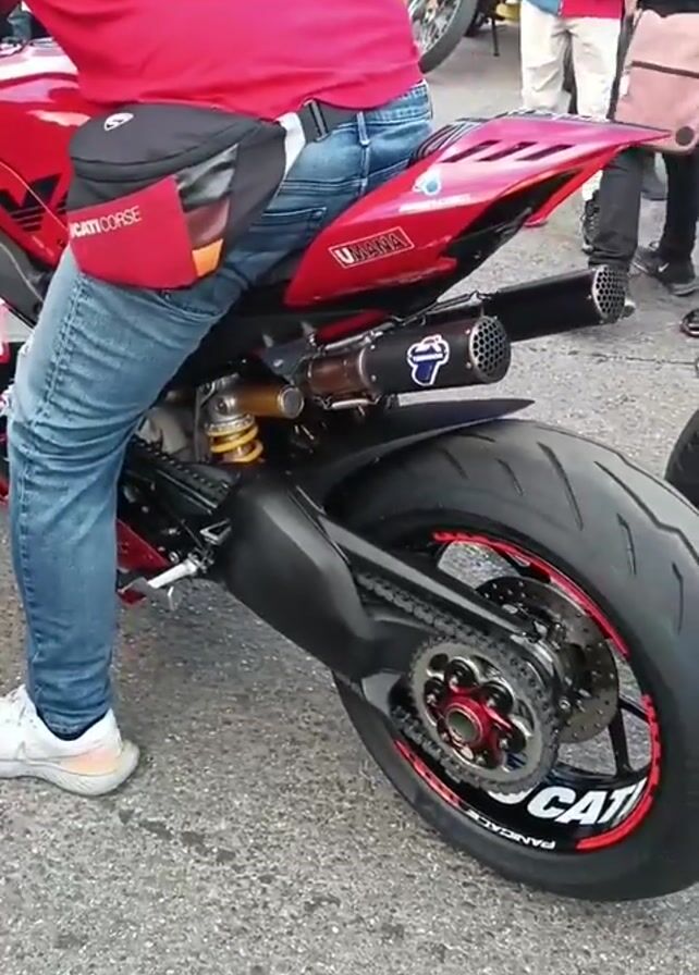 red Ducati motorcycle at what appears to be a gathering or event. A man wearing a red shirt and jeans is straddling the bike. The motorcycle is customized with a distinctive exhaust system. Several people are standing around, some taking photos or videos with their phones. The bike has red accents on the wheels and various stickers. The environment looks like an outdoor parking lot or street, with other bikes and pedestrians visible in the background. The engine makes a loud sputtering sound when it is turned on.