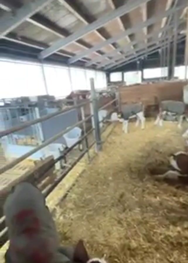 inside of a barn. On the left side are individual metal stalls with feeding stations. There are several calves in the stalls. On the right side, there are more calves resting on a bed of straw. The barn has a metal and wooden roof and there are windows along the back wall. The person filming is holding a small calf and moving along a barrier, passing the animal to the calves on the other side. The calf in the person's hands is brown and white.
