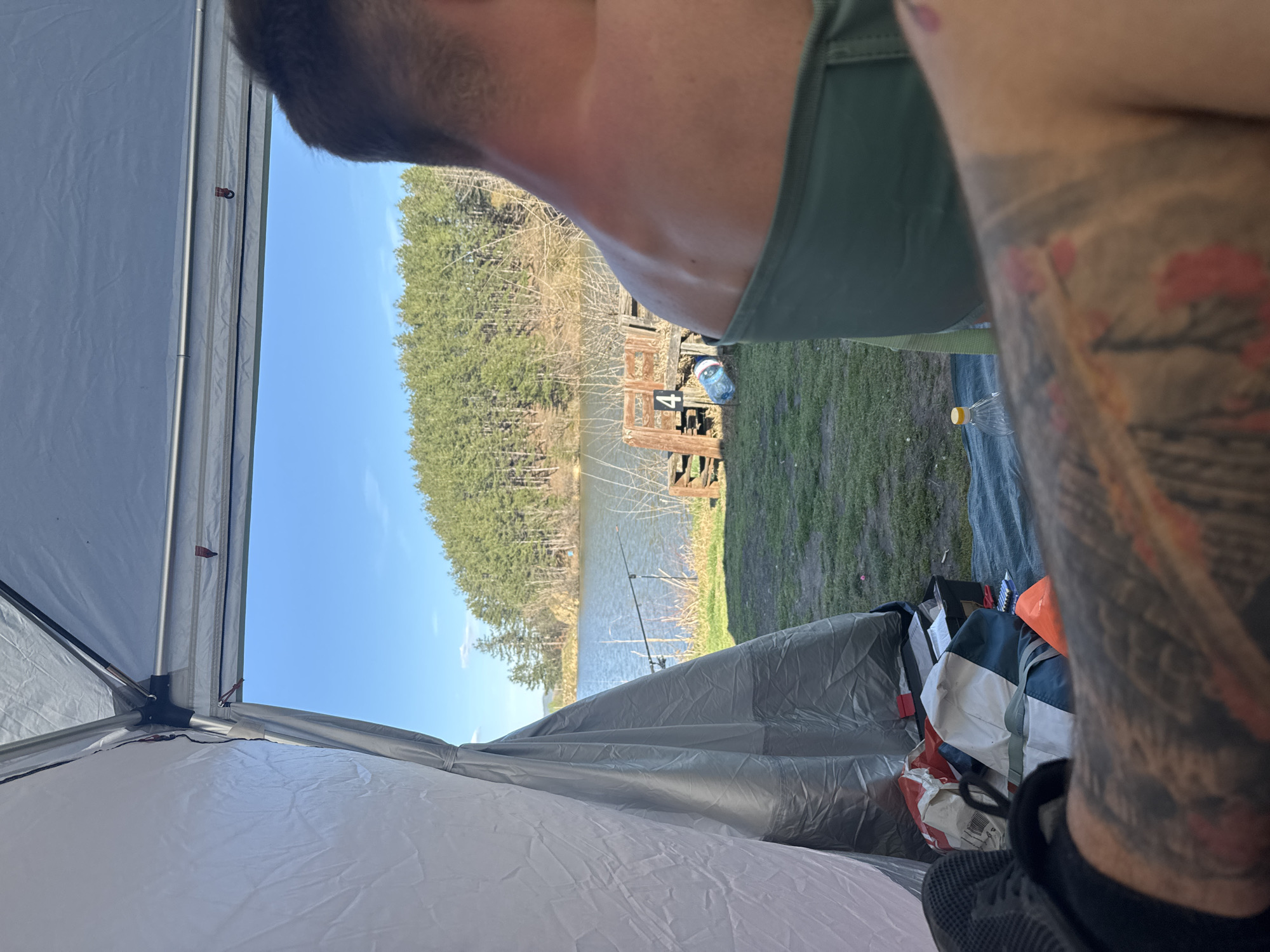 A person, identified by their skin tone and tattoos, is inside a tent. The tent is white and gray. Through the tent opening, a lake is visible, surrounded by trees and grass. A wooden structure with the number "4" is on the right side of the lake. A fishing rod stands near the lake. The location is identified as Slavovitsa, Bulgaria based on visual data.