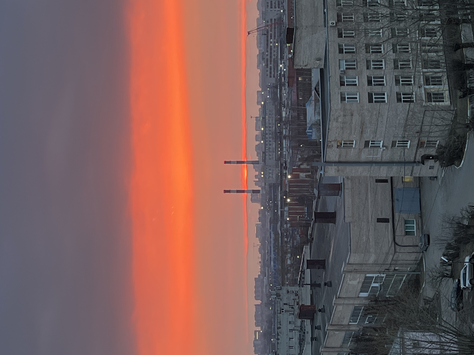 An elevated, static long shot captures an urban landscape at sunrise or sunset in Saint Petersburg, Russia, characterized by a dramatic sky and a mix of industrial and residential architecture. The upper two-thirds of the image are dominated by the sky, transitioning from a dark grey-blue at the zenith to a wide, intense band of orange-red and crimson along the horizon. A thin, brilliant orange line marks the immediate horizon, where the sun is either rising or setting, appearing as a small, bright orb positioned slightly right of center. In the midground, silhouetted against the vibrant sky, stand two prominent, tall industrial chimneys, striped horizontally in red and white/grey. Surrounding them is a sprawling expanse of low-rise, utilitarian grey-brown industrial or commercial buildings with flat roofs. Further back, a dense cluster of taller, block-style residential buildings forms the distant skyline, with a red construction crane visible on the far right. The immediate foreground features two multi-story, grey-toned buildings. The left building is an industrial-style structure with large, vertically oriented, gridded windows and a flat roof dotted with dark ventilation units. A light-colored sedan is parked near a blue garage door on its right side. The right building is an administrative or office type, featuring numerous white-framed rectangular windows; the year "1974" is inscribed above a top-floor window on its left facade. Bare deciduous trees and sparse winter vegetation are present in the lower-left foreground, where a silver SUV and a dark sedan are parked on an asphalt surface. No individuals or active interactions are visible in the scene. The prominent striped industrial chimneys are identifiable as belonging to the Saint Petersburg Thermal Power Plant (TEC-18), also known as the Right Bank TPP, located within the Krasnogvardeysky District of Saint Petersburg, Russia. The view captures the characteristic industrial and residential areas of the city's eastern sector.