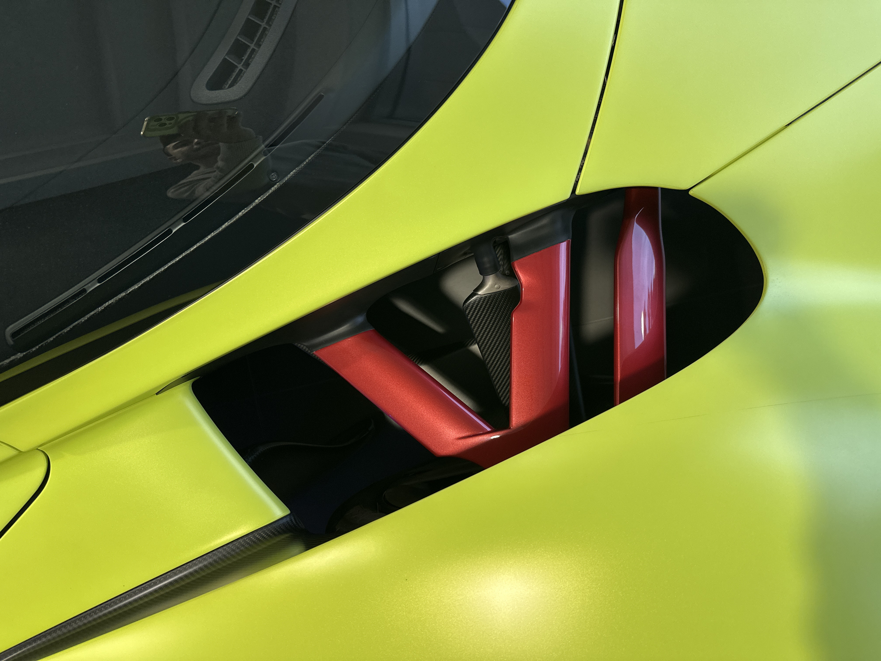 A close-up shot showcases a vibrant chartreuse car, possibly a sports car, with a unique air intake design. Three red bars run vertically within the intake, contrasting with the car's exterior. A section of carbon fiber is also visible within the intake structure. The windshield wiper and a reflective surface with a smartphone are visible in the top-left. The overall image highlights the car's striking color scheme and aerodynamic features.