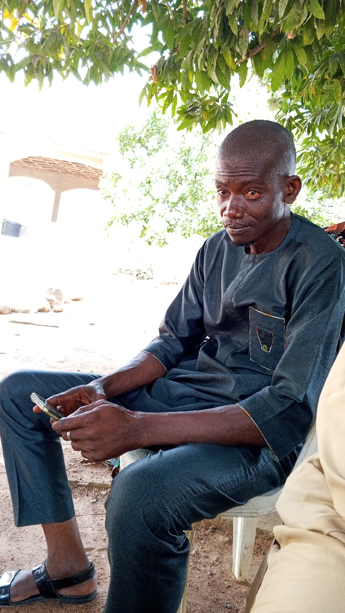 An adult male with dark skin and a bald head is seated outdoors on a white plastic chair in Ogbono, Nigeria