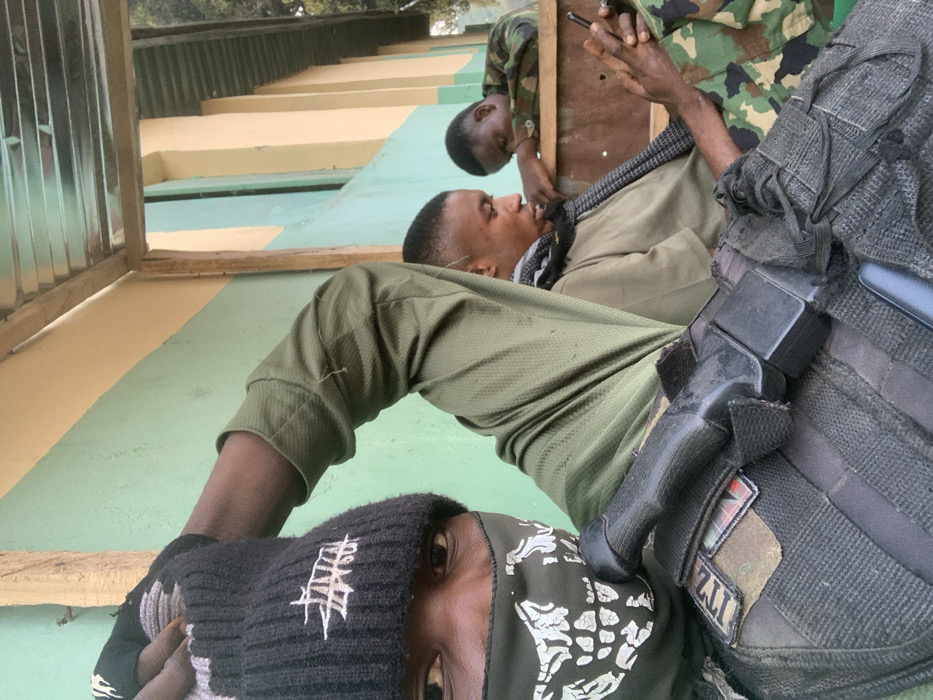 Three people are shown in the image. One person is wearing a black beanie and a bandana over the lower half of their face. To their right, a person in a tan shirt and scarf looks up. Next to them, another person in camouflage holds a cell phone to their ear. The people are in front of a tan and green painted wall. The person closest to the camera wears a tactical vest with a holster and magazine pouch.
