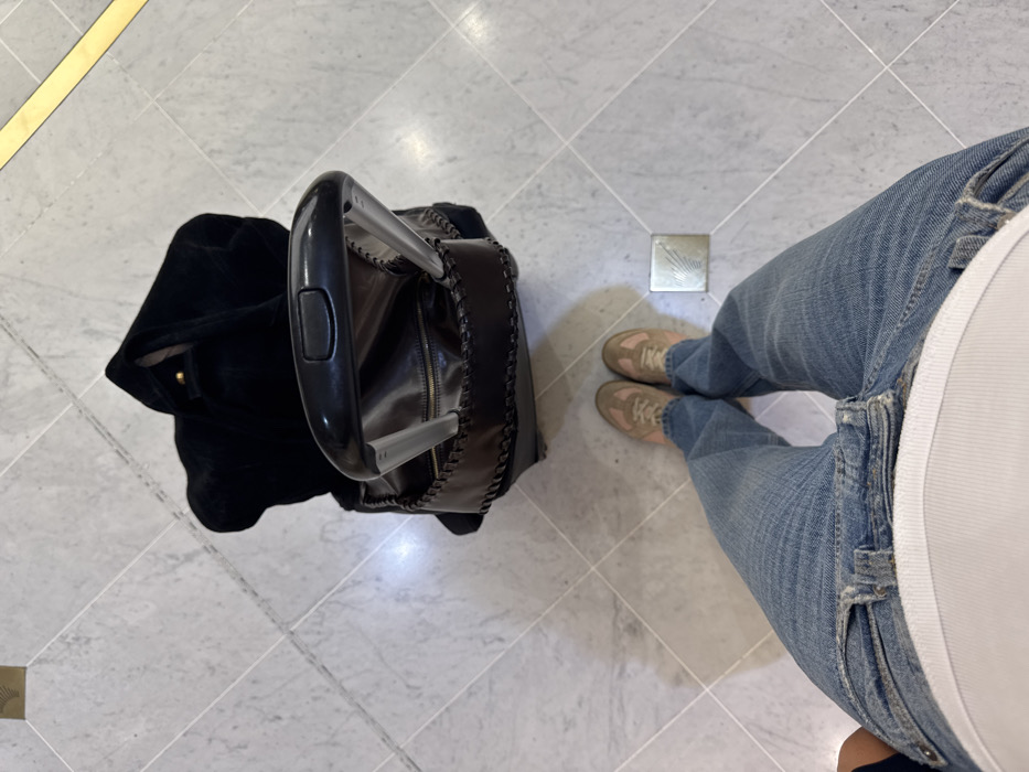 An overhead forensic view captures a stationary scene within an airport terminal, specifically identified as Charles de Gaulle Airport (CDG) in Tremblay-en-France, France, by the presence of the distinct 'Sol' emblem on a floor tile. The lower half of an individual is visible, wearing light blue denim jeans and beige and light pink athletic shoes. The waistband of a white garment, likely an undershirt or tank top, is visible at the bottom of the frame. Directly in front of the person stands a piece of black wheeled luggage with its black, two-pole extension handle raised. Resting on top of this luggage is a dark brown or black leather-like tote bag, distinguished by a prominent, braided or stitched rim. A gold-toned zipper pull is partially visible within the bag's interior. The floor is constructed of polished light grey or white square tiles, laid in a diagonal pattern with light grey grout lines. Two square metal floor inserts are present: one in the upper left features a circular sunburst design, and another near the person's right foot displays a faint embossed leaf or feather pattern. A narrow, reflective gold-colored strip runs diagonally across the floor in the upper right portion of the image.