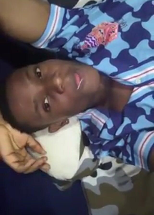 A person lies on a bed, looking at the camera. The person is wearing a blue and white patterned shirt. The bed has a gray, brown, black, and white camouflage pattern. The person's left arm is resting on a white pillow. The bed also has a dark blue part visible. The person is centered in the frame.