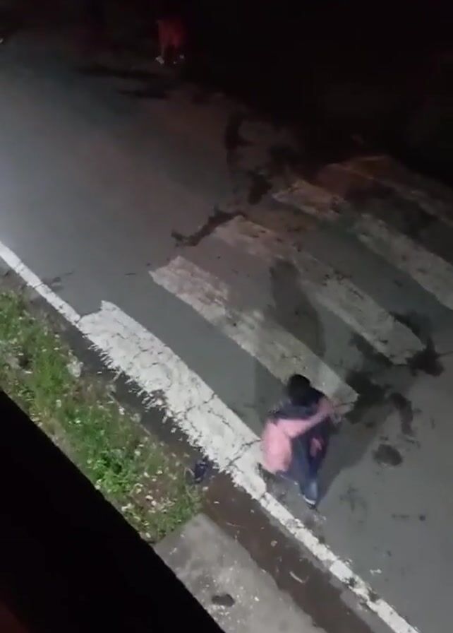 At night, a high-angle shot reveals a group of people near a crosswalk on a paved road. The crosswalk is marked with broad white stripes, showing signs of wear and cracks. On the side of the road is a curb and a patch of greenery. Several people are walking near the crosswalk, while one individual is seen walking across it wearing a dark jacket with a pink accent and a backpack. The lighting is dim, casting shadows and making details difficult to discern.
