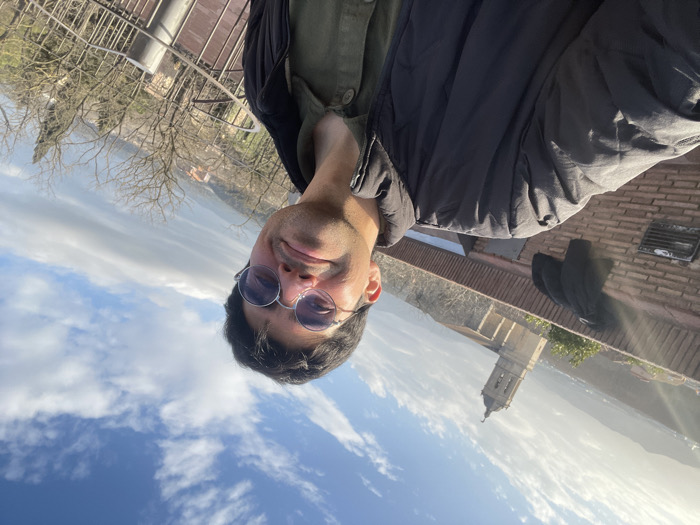 A man wearing sunglasses and a dark jacket takes a selfie outdoors. Blue sky with scattered clouds dominates the background. A distant church tower is visible. A brick wall with a dark object on top of it is at the right edge. Some bare branches of trees are slightly visible in the background. The image has been rotated 180 degrees.