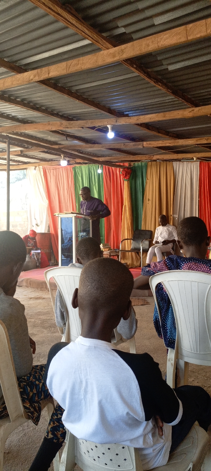 The scene depicts an indoor gathering within a rudimentary structure in Unknown, Unknown. The roof consists of corrugated metal sheets supported by rough wooden beams, from which several bare LED bulbs provide illumination. The background features a backdrop of vertically draped fabric in sections of green, red, orange, white, and tan, with a red floral decoration attached to the orange fabric. The floor appears to be bare earth. Eight individuals are visible. A male speaker, wearing a dark purple long-sleeved shirt and glasses, stands behind a transparent podium with a blue base, addressing the assembly while looking at an open book. His left hand rests on the book. To the speaker's right, a male in a white long-sleeved shirt is seated on a black office-style chair, holding a pen and notebook, appearing to take notes. On the far left, a person wearing red headwear and a patterned garment is seated on a red mat next to a red metal barrel. In the foreground, three individuals are viewed from behind, seated on white plastic chairs, facing the speaker. These include one person in a grey shirt, one in a white t-shirt with black sleeves, and one in a blue patterned garment. All visible foreground individuals have short, dark hair. A fourth person in a light-colored shirt is partially visible behind the center foreground individual. The individuals are engaged in listening or presenting within what appears to be a meeting or service.