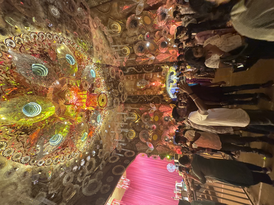 This image depicts a densely populated interior of an elaborately decorated temporary structure, likely a Durga Puja pandal, located in Bidhannagar, India