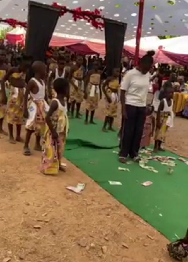Under a tent decorated with lights and red tinsel, a group of children in traditional clothing perform a dance on a green runner with money scattered on it