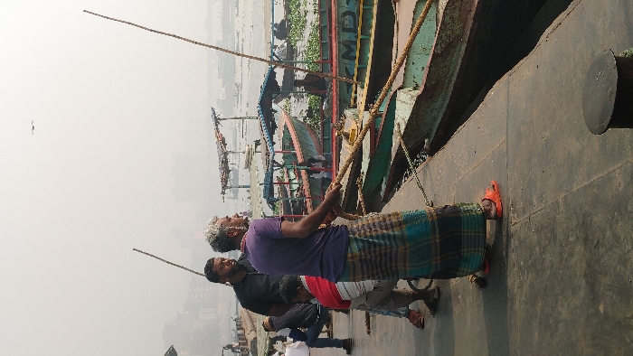 Three men stand beside a docked boat, manipulating ropes attached to it. The first man wears a purple shirt and a patterned sarong, the second a black shirt, and the third a red and white shirt. Other individuals are visible in the background. The river water is in the distance, with additional boats docked nearby. The sky is overcast, and a bird is flying in the distance.
