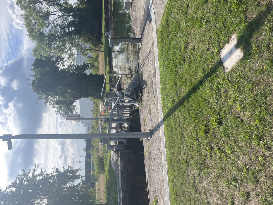 The image displays an outdoor scene of a canal lock system located in Eschau, France, under a sky with prominent white cumulus clouds and visible blue patches, indicating daylight conditions. In the immediate foreground, a mowed grass area, sparsely mixed with weeds and drier patches, occupies the lower third of the frame. A long, dark shadow, cast by a tall, silver-colored metal pole, extends from the center of the image towards the lower right. A small, square concrete slab is partially visible within the grass in the lower right corner. A horizontal concrete path with a metal grate drainage system separates the grassy area from the lock structure. The midground features the operational components of the canal lock. On the left, a concrete lock wall descends into a deep, dark water chamber, with the left lock gate appearing in an open or partially open position, revealing its metallic structure and green algae growth. Towards the right, a metal walkway with railings and integrated automated control panels or machinery extends over the canal. The canal water visible on the right side of the lock is murky and covered extensively with a layer of green algae or aquatic vegetation. A tall, grey control pillar with a small red indicator light is positioned on the right concrete bank, adjacent to the water. The background consists of dense green foliage from large trees bordering the canal on both the left and right sides. Beyond the trees on the left, an industrial zone is visible, characterized by large, light-colored industrial buildings, a dark green shipping container, and multiple construction cranes against the horizon. No individuals are present within the frame.