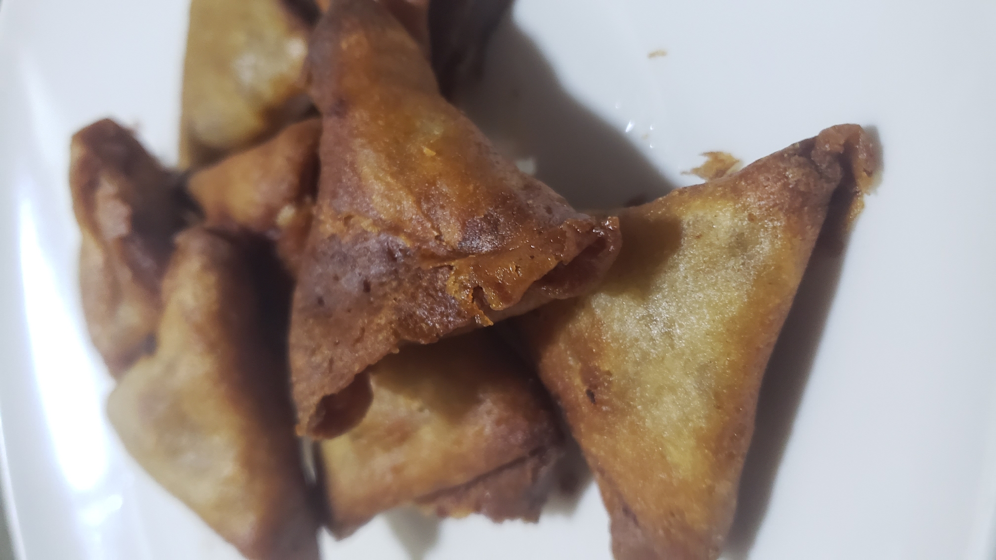 The scene is set in Sabon Tasha, Nigeria. A close-up, high-angle shot captures a cluster of approximately ten irregularly shaped, triangular fried food items resting on a plain white, possibly ceramic, plate. The items exhibit a range of golden-brown to darker, crispier brown coloration, suggesting deep-frying. Textural details visible include slight bubbling and unevenness on the surface of the fried dough, indicating a crisp exterior. The foreground items are in sharp focus, while those further back are slightly blurred, consistent with a shallow depth of field. No people, specific actions, or environmental details beyond the white plate are discernible.