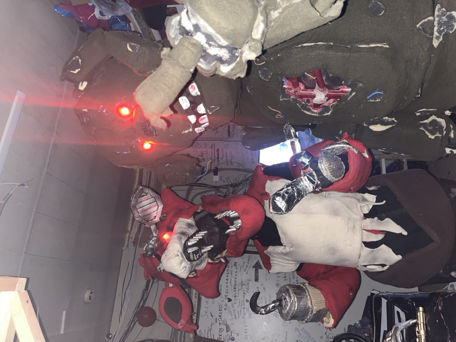 The image displays homemade animatronic figures, reminiscent of "Five Nights at Freddy's" characters, posed in a room