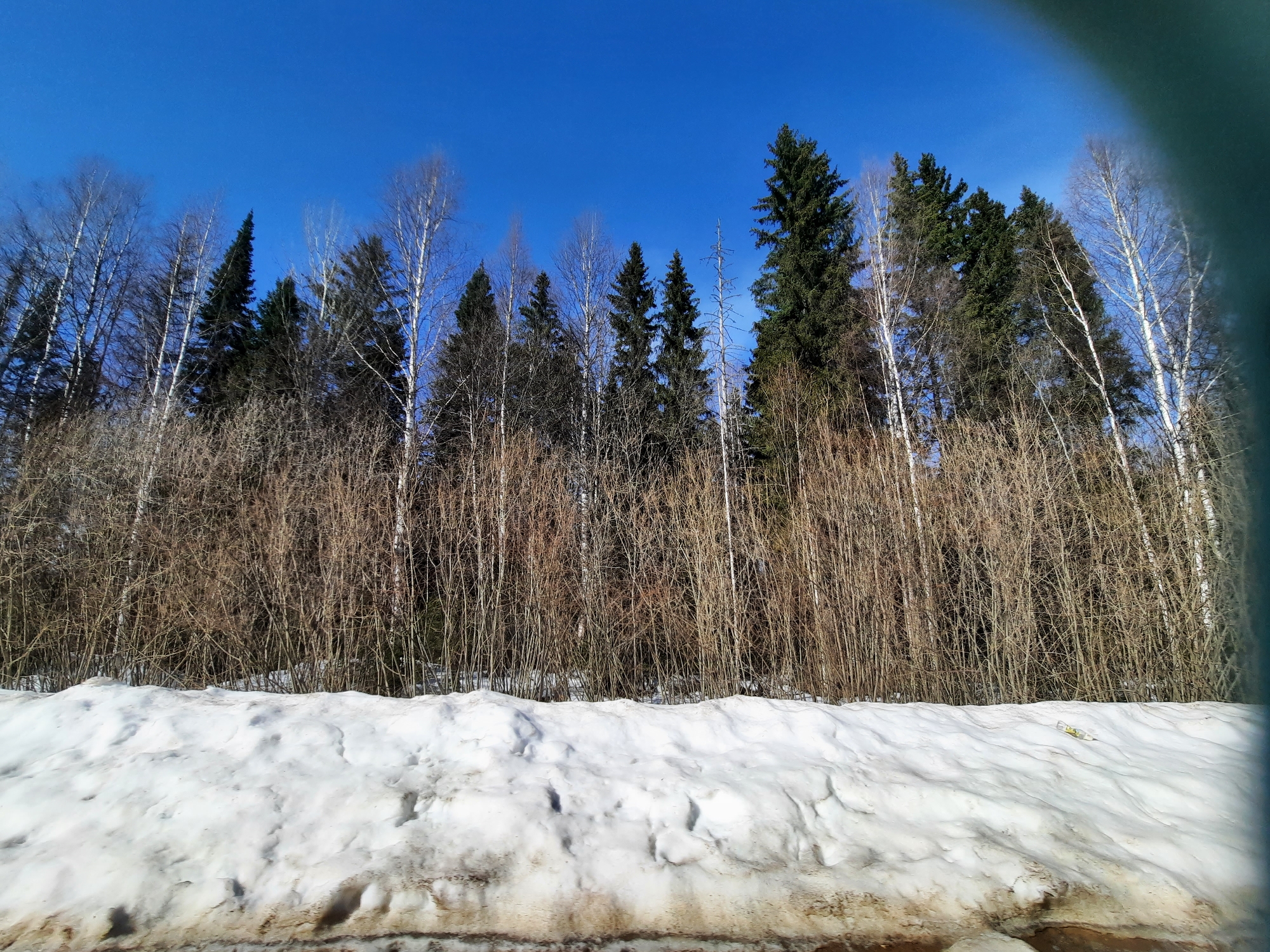 The image depicts a winter or early spring landscape in Архангельское, Russia. The upper third of the frame is dominated by a clear, vibrant blue sky. Below the sky, a dense forest line extends horizontally across the middle ground. This forest consists of a mix of tall, slender, white-barked birch trees with bare branches, interspersed with dark green coniferous trees. Beneath these taller trees, a thick, uniform band of bare, brown, deciduous shrubs or young trees forms a lower layer of vegetation. The foreground features an uneven accumulation of white snow, which shows significant brown discoloration and dirt accumulation along its base. A small, yellow, rectangular object is visible resting on the snow in the foreground, slightly right of center. A dark, curved obstruction is present in the top right corner of the image, consistent with a vehicle's interior frame or window edge. No people are visible.