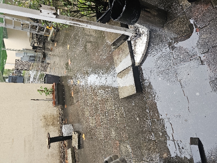 This image captures a wet, paved outdoor area in Batumi, Georgia. The ground, surfaced with dark gray pavers, is covered in standing water that reflects light, and is scattered with small light-colored debris and a few yellow-brown leaves. No individuals are visible. On the left, a light-colored wall displays water stains. Two gray concrete pavers are partially submerged in the foreground. A black metal pedestal with a circular top rests on a gray concrete block. Further back, a rectangular planter holds a green plant with a stake, positioned next to a dark gray cylindrical bin or planter. On the right, a white vertical metal support post rises from a curved metal base plate. A black trash can with a liner stands at the base of this post. Two gray concrete pavers are partially submerged adjacent to the base plate. A small green bush is situated to the right of the post. In the mid-ground, a silver A-frame step ladder is present, leaning against an obscured structure. Behind the ladder, various construction materials, including metal elements, are visible. A black and white striped barrier is partially discernible in the background, beneath a green mesh canopy.