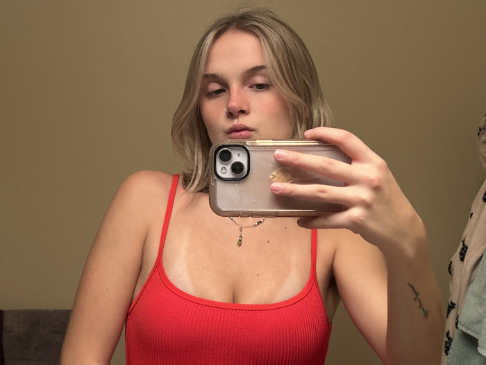 A blonde woman in a red, ribbed tank top takes a selfie in a bathroom. Her phone covers part of her face. She wears a delicate necklace. She has visible tan lines on her chest and shoulders. A tattoo is visible on her right forearm. A beige wall is behind her and part of a towel or robe hangs in the background on the right side of the frame.