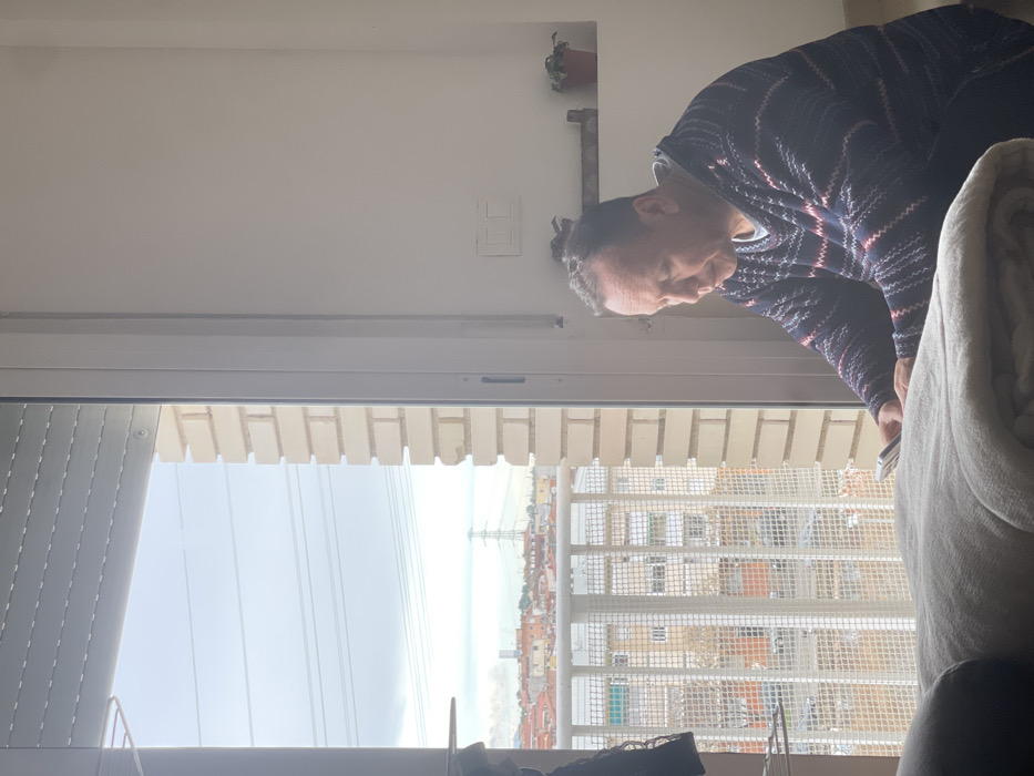 An adult male is seated on a low surface or floor inside a residence in Terrassa, Spain, positioned in profile facing right. He is wearing a dark blue, red, and white patterned sweater over a light undershirt and dark trousers. The subject is actively engaged with a white smartphone held in both hands. A light-colored rolled or folded blanket is partially visible in the immediate foreground. The interior wall to the subject's right is white, featuring a white double-gang light switch and a small mounted shelf displaying a potted plant. To the subject's left, an open balcony door, partially obscured by a lowered rolling shutter, provides a view of the exterior. The outdoor environment consists of a white grid-patterned safety barrier, beyond which a dense urban residential area with multiple-story buildings and red-tiled roofs extends under an overcast sky. Power lines are visible traversing the mid-distance, along with a prominent electricity pylon. A hazy body of water, consistent with the Mediterranean Sea, is discernible on the distant horizon.
