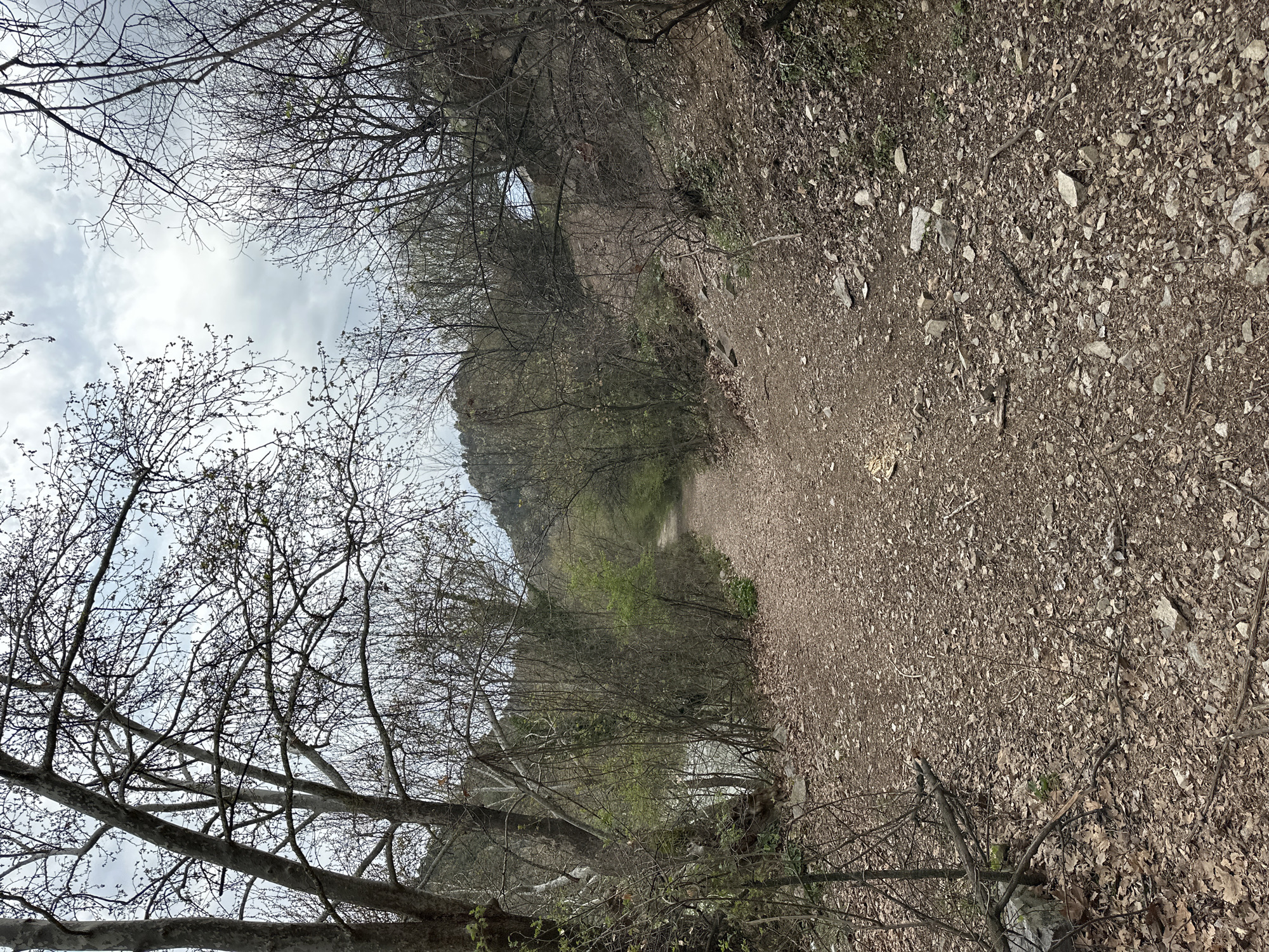 The image depicts a dirt path winding through a wooded area. The path is covered in leaves and small rocks. Trees line both sides of the path, with bare branches reaching towards a cloudy sky. Some new growth is visible on some of the trees. The location is Stara Kresna, Bulgaria. There are no people visible.