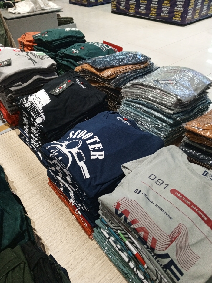 Neatly stacked t-shirts in various colors and designs are displayed. A dark blue shirt features the word "SCOOTER," while a gray shirt reads "DESIGN ESSENSE" and "VECTOR SHAPES." Some shirts are individually wrapped in plastic. Additional stacks showcase orange, green, and black shirts. The words "HARGA LEBIH MURAH" repeat on boxes in the background.