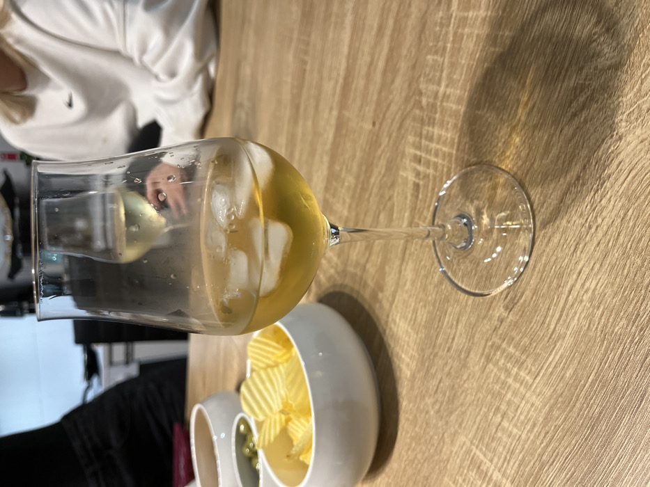 The scene depicts an indoor setting, likely a dining or kitchen area, in Cannes, France. In the foreground, a clear stemmed glass containing a light amber-colored beverage with several ice cubes is positioned on a light brown wooden table. Condensation droplets are visible on the exterior of the glass. To the left of the central glass, a white bowl holds ridged potato chips. Behind it, another white bowl contains green olives. A third white bowl is partially visible further back on the left. In the mid-ground background, two individuals are partially visible. On the left, a person wears dark clothing, possibly black trousers. On the right, another individual wears a white long-sleeved top featuring a black Nike swoosh logo on the chest. This person's hands are visible, holding a separate stemmed glass with a light-colored liquid. The far background reveals elements suggesting a kitchen environment, including light-colored surfaces and potential cabinetry.