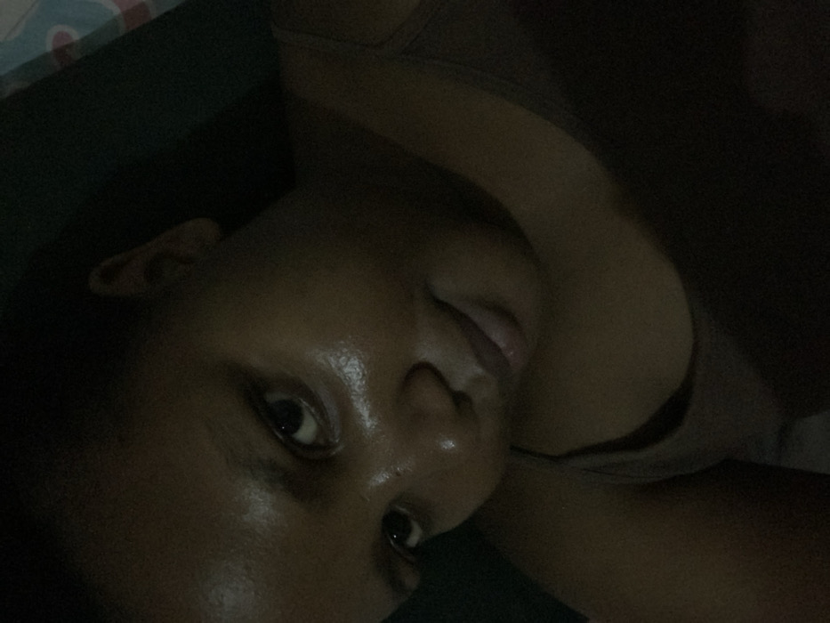 The image displays a head and upper torso shot of an individual, likely female, with dark skin, positioned indoors in dim lighting