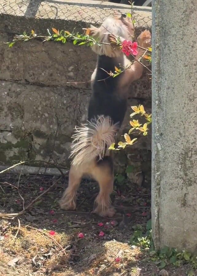 - "small black and tan dog standing on its hind legs, attempting to reach a red flower growing on a vine against a gray stone wall" by FM-3q1Os1, licensed under CC BY 4.0