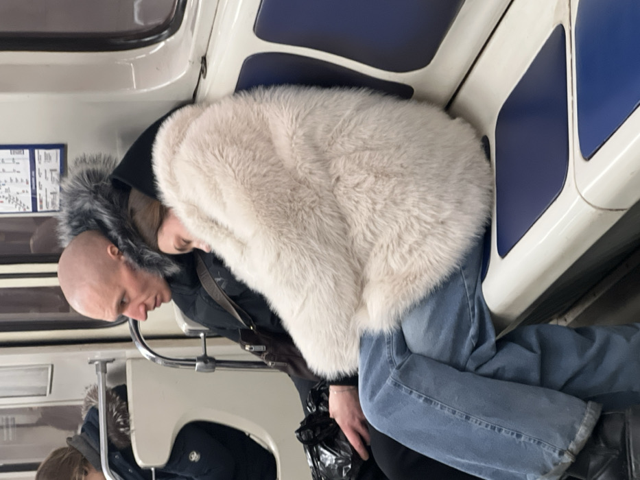 Inside a subway car, a person wearing a large, fluffy white coat leans against the wall. The individual sits next to a bald man in a dark jacket with a furry hood. He looks downwards. The subway car's interior features blue and white seating, with other passengers visible in the background. The scene appears candid, captured during a regular commute.
