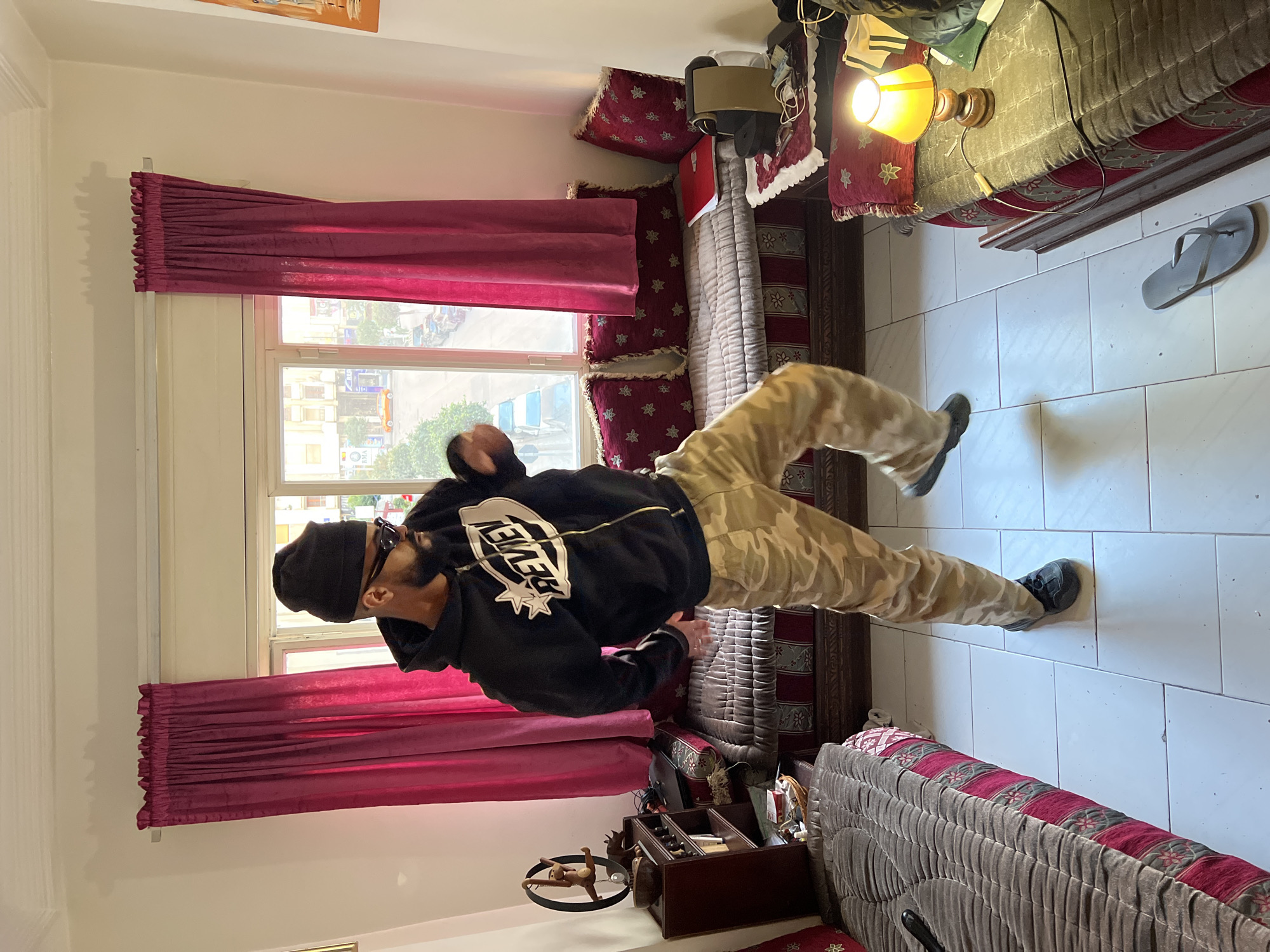 A man in a black beanie, sunglasses, black hoodie, and camouflage pants stands in a room in Tanger, Morocco. The room has red curtains, and the man is near a window. Cushioned benches and an ornate side table with a lamp are also visible.