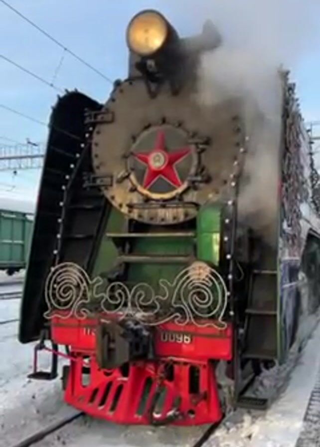 A steam locomotive stands in a snow-covered train yard. The locomotive is painted in a variety of colors, including black, silver, green, and red. It is decorated with a red star on the front and a light on top. Steam is coming out of the top of the locomotive, and there is a green train car in the background.