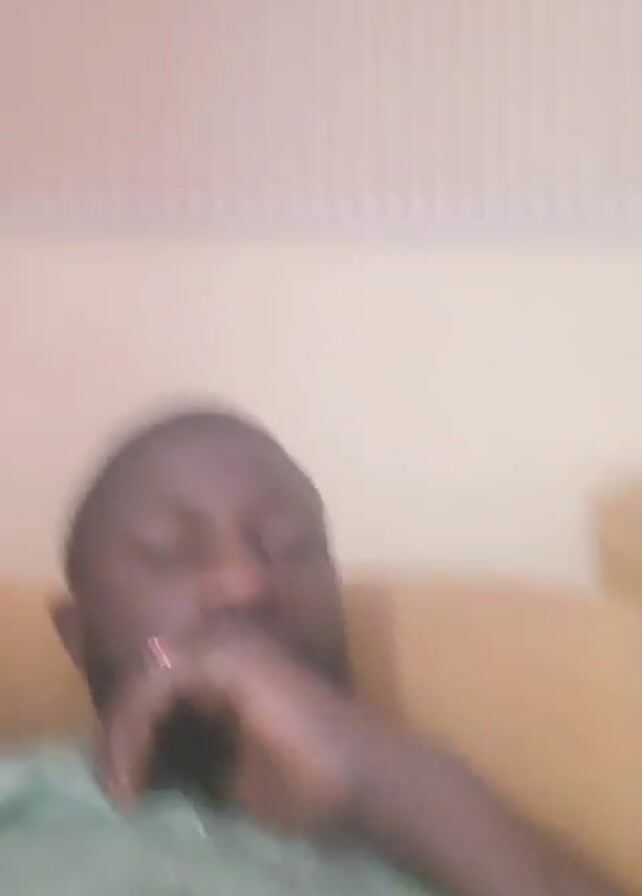 A man is sitting on a yellow couch, looking at the camera with a pensive expression. He has a dark complexion, a shaved head, and a beard. He is wearing a light green shirt. His left hand is resting on his chin and he has a ring on his finger. The background is a plain wall with white striped paneling near the top. A light fixture is visible on the paneling. The camera is slightly shaky, and the focus fluctuates.