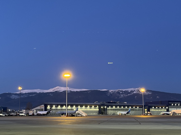 - "The image depicts an airport apron scene at twilight, characterized by a deep blue sky above snow-capped mountains" by FM-XxW2N2, licensed under CC BY 4.0