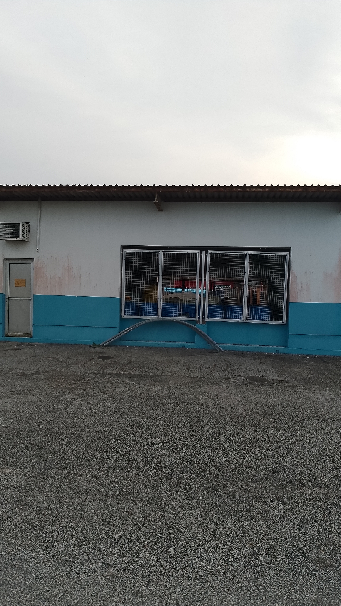 This image depicts the exterior of a building in Orerokpe, Nigeria, under an overcast sky. The building features a brown corrugated roof and walls painted in two horizontal sections: the upper portion is white, and the lower portion is turquoise/teal. The white wall exhibits some reddish-brown staining near the left side. On the far left, a light gray metallic door is visible, featuring a yellow triangular caution symbol. Above and slightly to the left of this door, a white outdoor air conditioning condenser unit is mounted on the wall. To the right of the door, two large rectangular window openings are present. Each opening is secured by two silver-colored metal mesh grates, totaling four grates across the two windows. Through the grates and glass, reflections indicate the presence of blue objects, possibly barrels or containers, and faint red text within the interior of the building. Below the window openings, a gray, arched conduit or pipe emerges from the ground, curves outwards, and then re-enters the ground. The foreground consists of a dark gray, textured surface consistent with asphalt or a similar paved material, covering the area in front of the building. No individuals, actions, or interactions are visible in the scene.