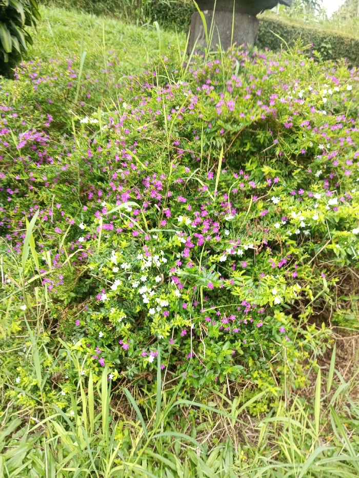 A vibrant patch of green foliage is dotted with small, delicate flowers. Most are a deep pinkish-purple while others are a clean white. Long blades of grass pierce through the foliage, reaching upward. Behind the flowers are taller grasses and a concrete structure, blending seamlessly with the verdant landscape. The shot is taken outdoors, likely on a hillside.