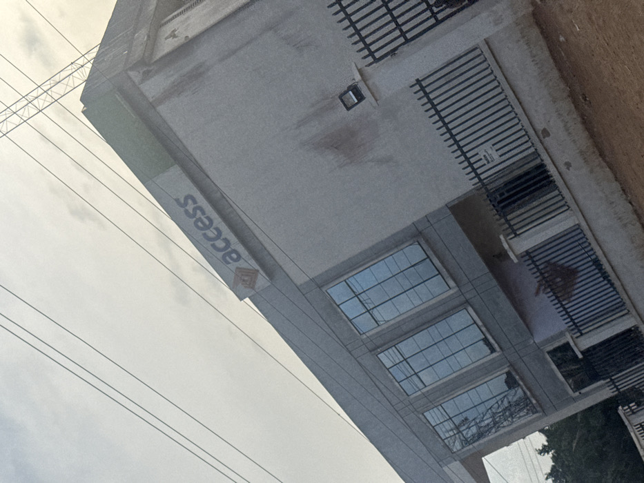The image depicts an oblique, upward-looking view of an Access Bank branch building located in Ekwulobia, Nigeria