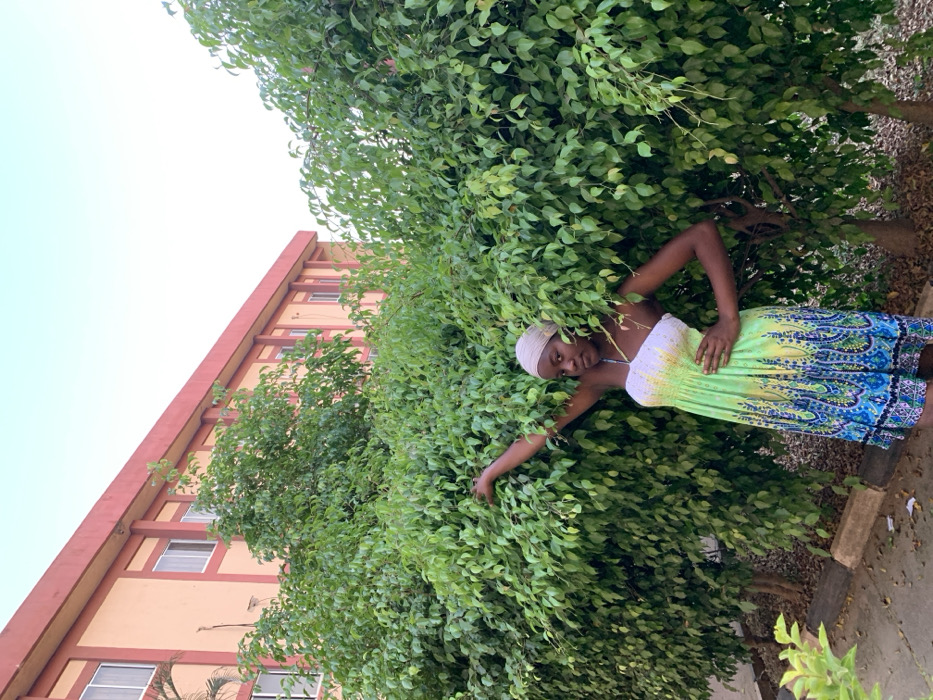 A young woman wearing a vibrant dress poses against a dense green bush or tree. Her left arm extends towards the foliage, while her right hand rests gently on her waist. She's wearing a head covering. The scene is outdoors, with a multi-story building visible in the background, adding to the setting. The light suggests it is daytime.