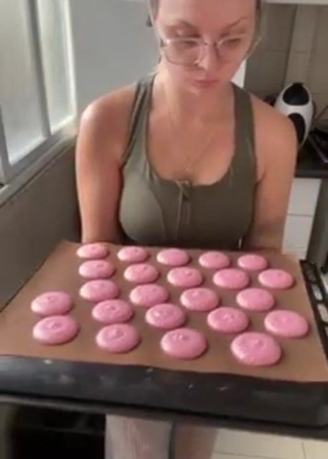 A woman stands indoors, holding a baking sheet with 21 round, pink macarons resting on parchment paper. She taps the pan several times with her hand. She wears an olive green tank top, striped pants, and glasses. The environment appears to be a kitchen with white cabinets and a window with white frames in the background.