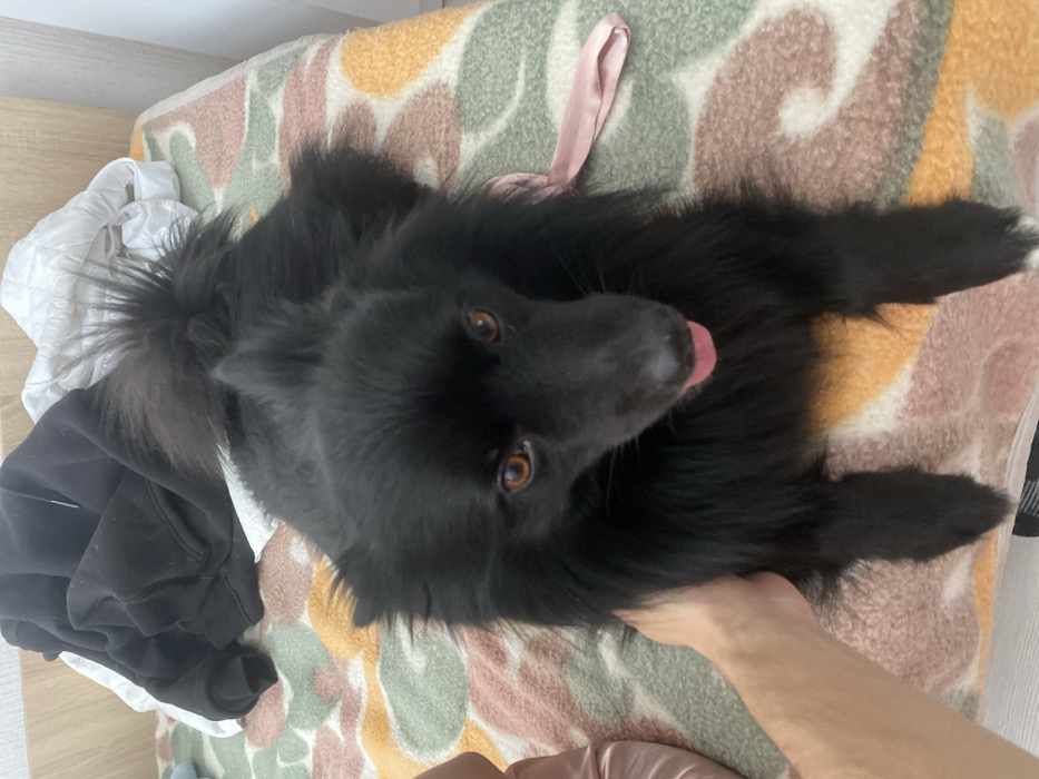 - "The image displays an indoor scene featuring a black, long-haired dog with amber eyes and a partially exposed pink tongue, positioned centrally and looking directly forward" by FM-siOCL2, licensed under CC BY 4.0