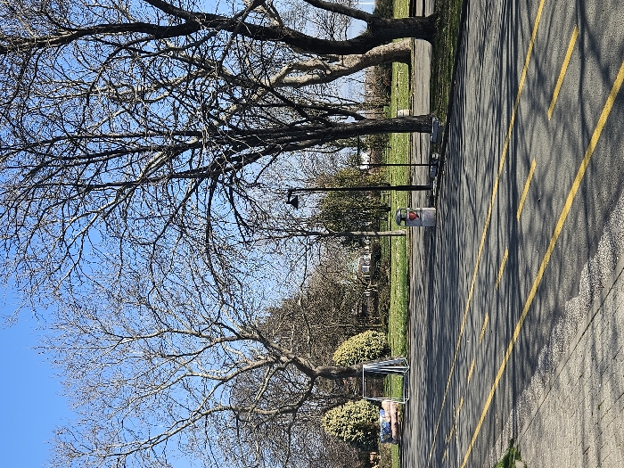 The image depicts an outdoor recreational area in Burgas, Bulgaria, under a clear blue sky. The foreground and mid-ground are dominated by an asphalt path featuring parallel yellow dashed lines. To the left of the path is a grey concrete sidewalk. Numerous deciduous trees, currently bare of leaves, line the area, casting distinct shadows across the path and ground. In the mid-ground, a grey cylindrical trash receptacle with a red heart-shaped symbol is situated to the right of the path, adjacent to a black lamppost. Further right, a light-colored, multi-segment bench is visible beneath the trees. On the left side of the path, set back on a grassy area, a small, white-framed football goal with a net is present. To the immediate left of the football goal, a low, irregularly shaped, multi-colored structure or artwork rests on the ground. No individuals are depicted. Distant, light-colored buildings are discernible through the bare tree branches in the background. The scene is illuminated by natural daylight.